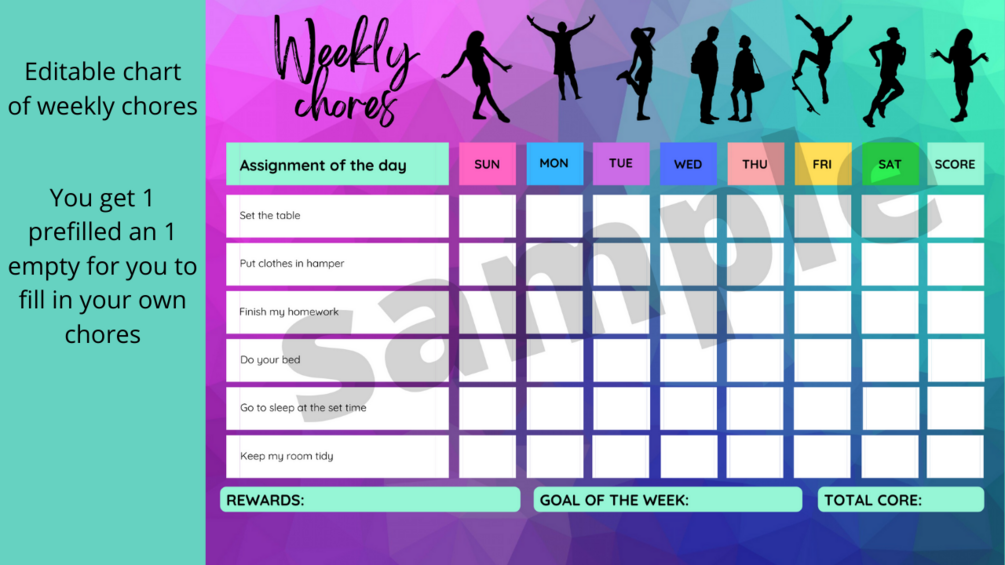 The form comes in two versions, one filled with pre-written chores and the other with blank boxes to fill in your own chores. The PDF can be edited in a pdf editor like Foxit reader - you can add your own chores to the fields.